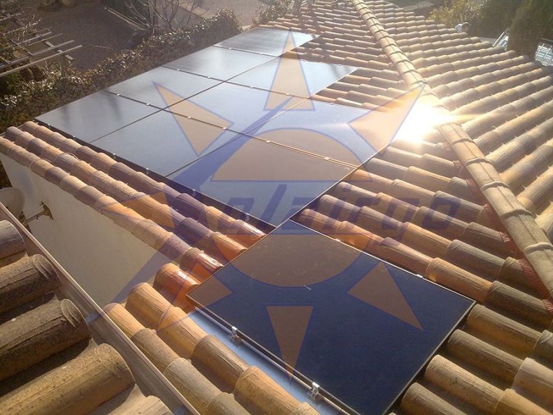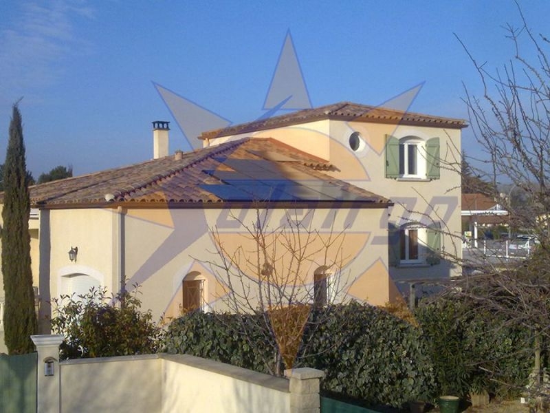 Installation photovoltaïque à Vergèze dans le Gard (30) en raccordé réseau. Système pose en toiture en triangle pour une esthétique conservée et une orientation offrant une rentabilité maximale du champ photovoltaïque.