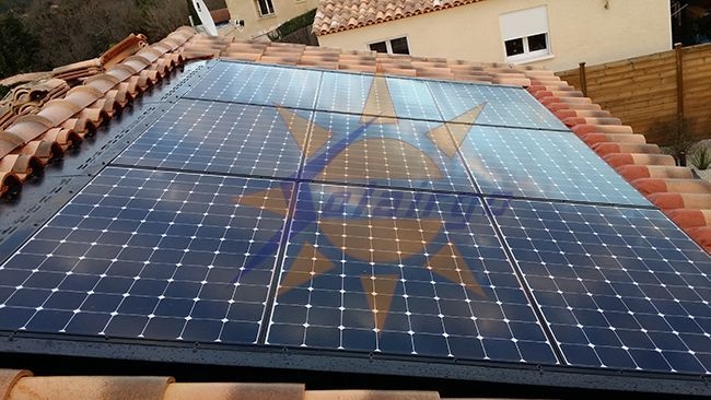 Installation photovoltaïque à Cannes et Clairan dans le Gard (30), système photovoltaïque avec intégration des panneaux au bâti (intégration des modules solaires en toiture. Les panneaux solaires permettent de réaliser l’étanchéité). Cannes et clairan dans le Gard (30) Image 1 parmi 4