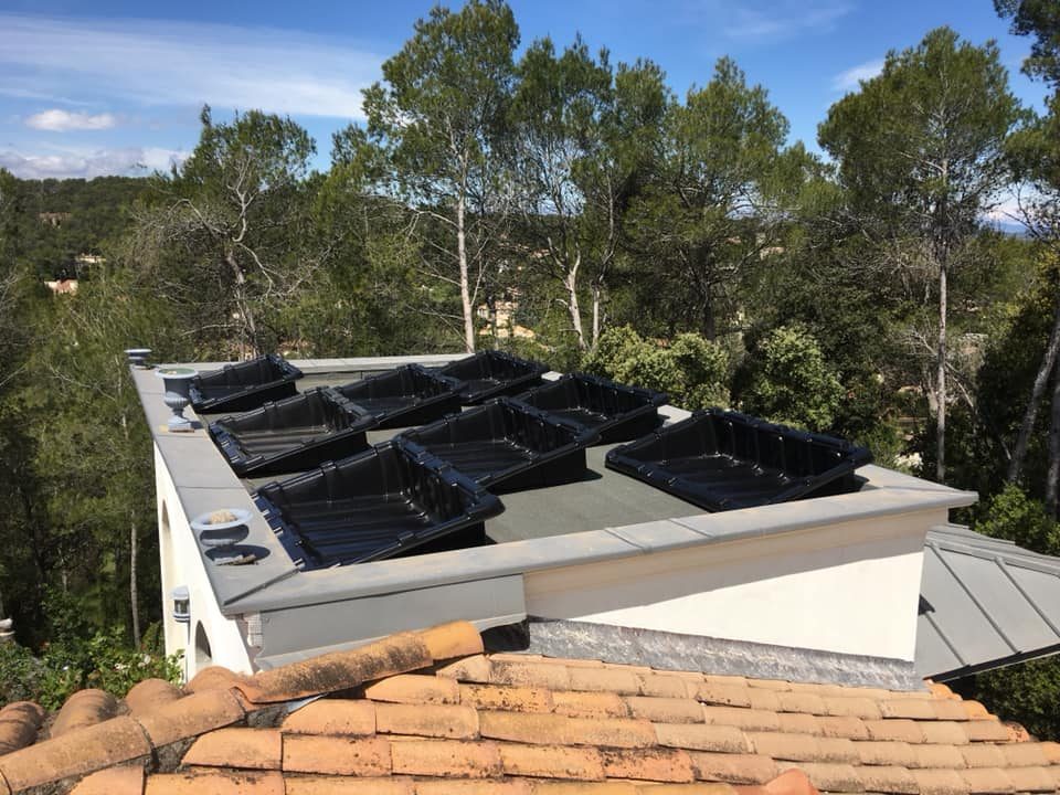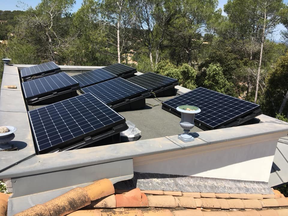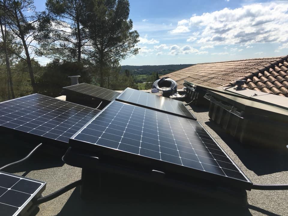 Installation à Saint-Clément-de-Rivière(34) d’un système autoconsommation 3 kWc panneaux solaires Sunpower avec électronique de conversion micro-onduleurs Enphase. Pose sur toiture plate avec système Console de Rénusol. Console Renusol est un bac polyéthylène lesté avec du gravier permettant d’accueillir de nombreuses marques et modèles de module photovoltaïque. Permet une pose sans perçage sur toit terrasse